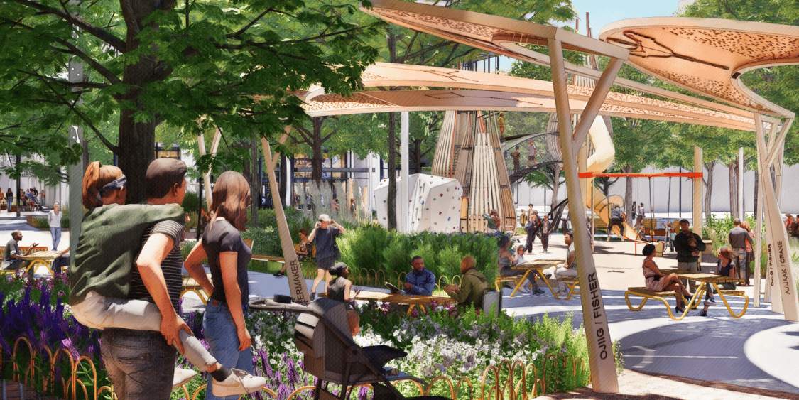 The preferred park design for the future park at the Bloor & Dufferin development is currently in its third phase of community engagement. Community members are being encouraged by the City of Toronto to complete an online survey to provide feedback on the preferred design–developed by STUDIO tla through two previous phases of community engagement–that is imbued with Indigenous values, history and storytelling.